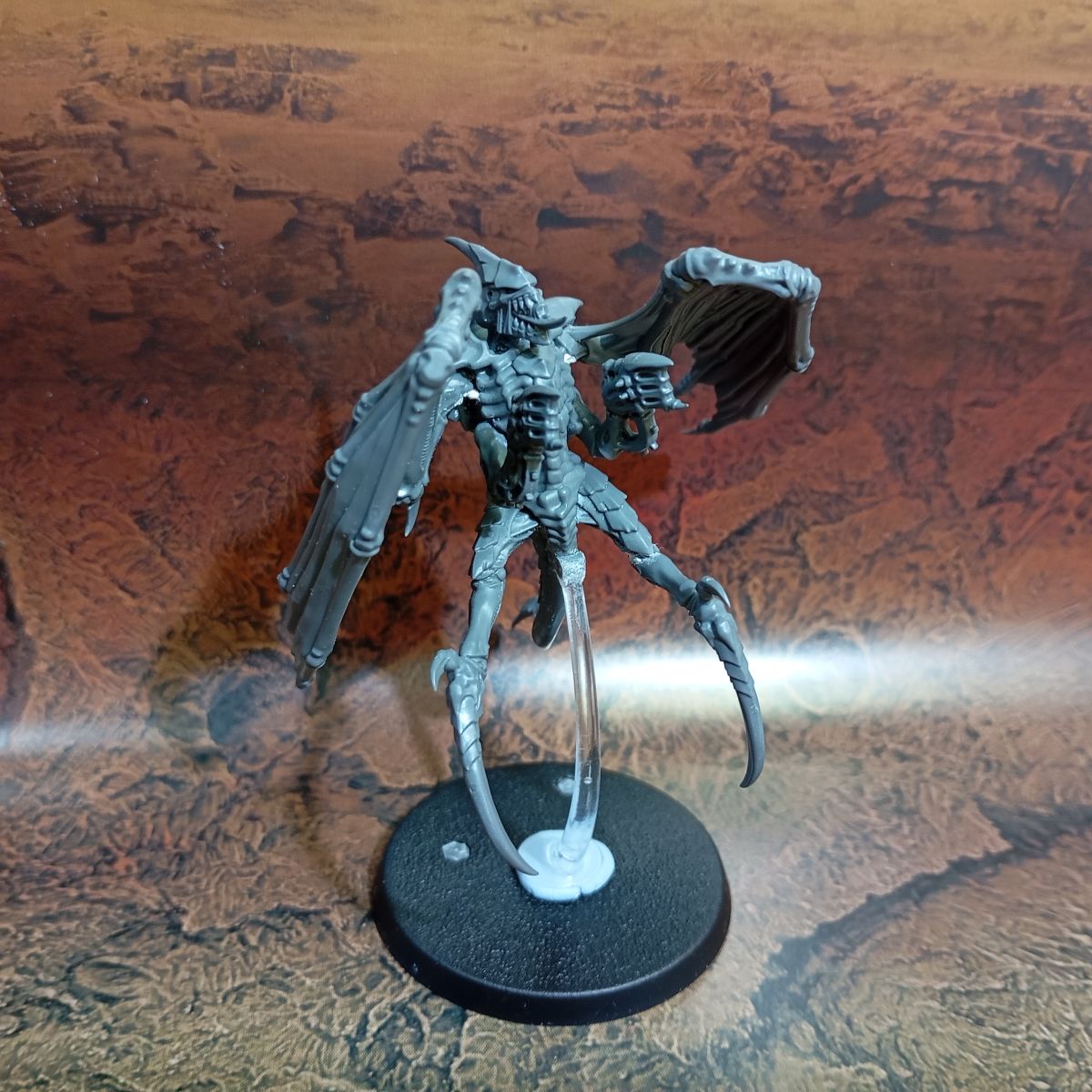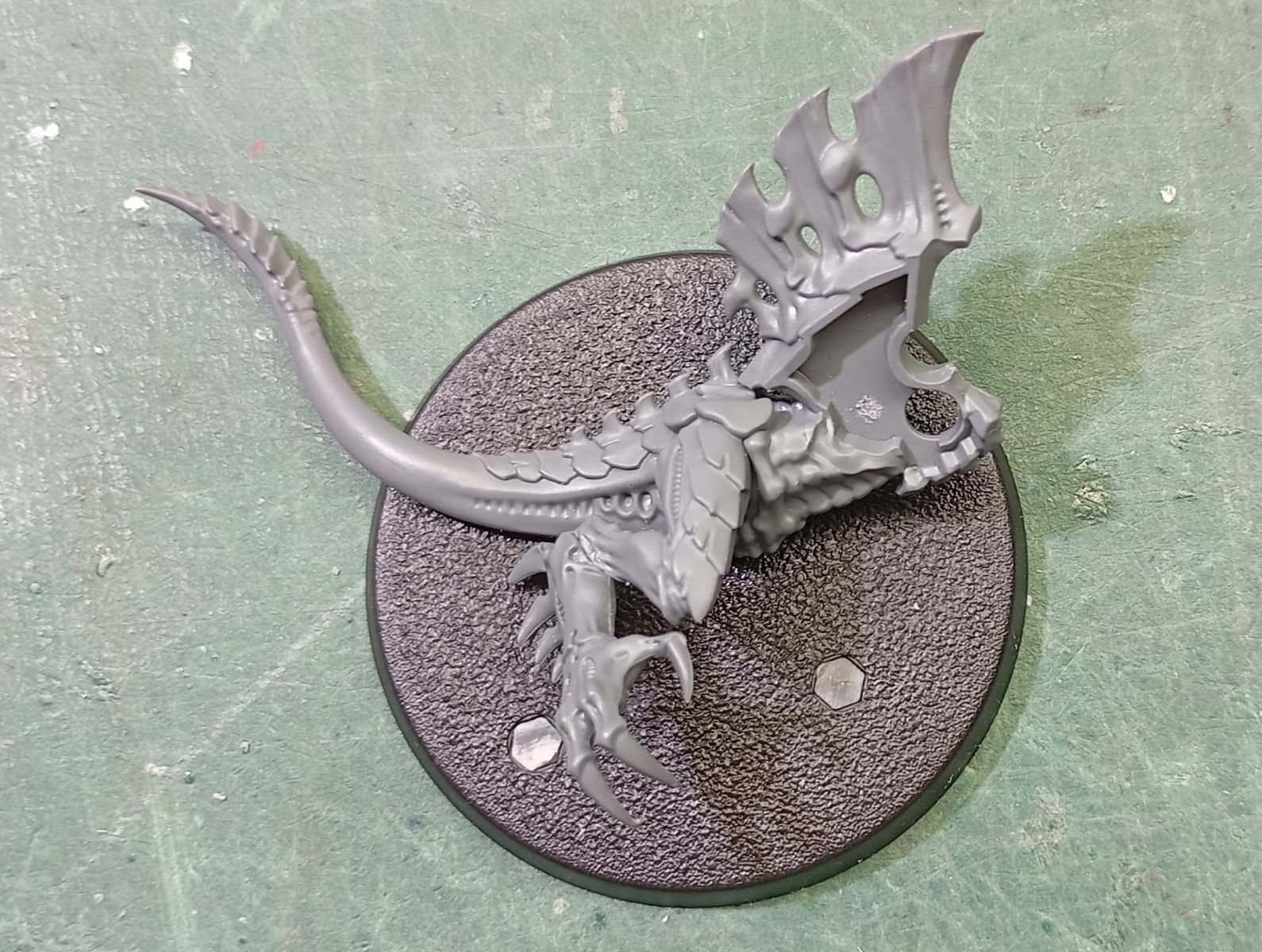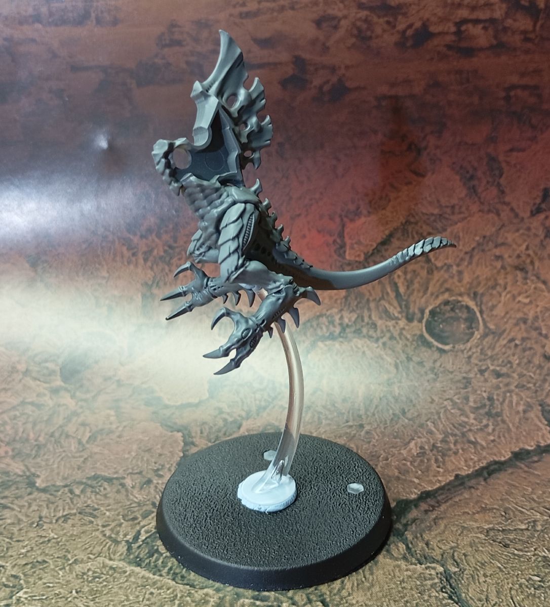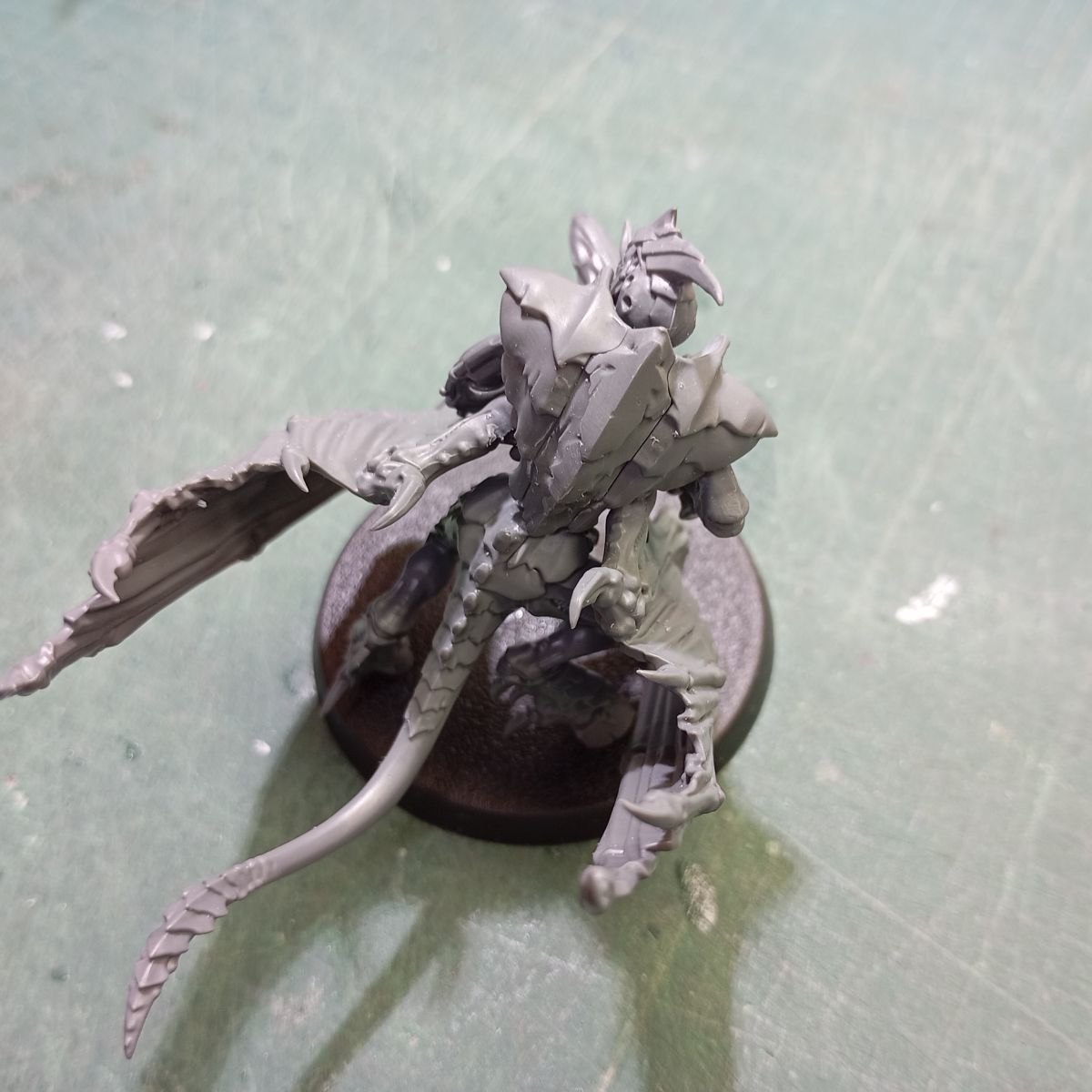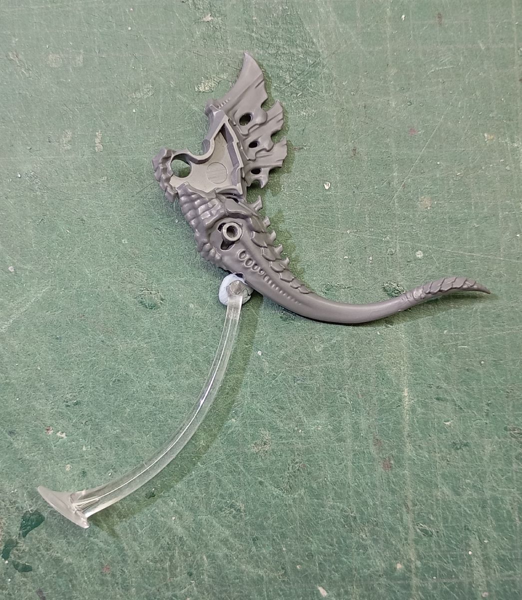 - Lo primero es tener claro qué tipo de tropa queremos hacer; en mi caso primero haré una conversión del Prime Alado en una peana voladora, con lo que voy a mantenerle las crestas dorsales y el montaje inicial es el mismo que la figura original, pero como quiero colocarla sobre una peana voladora, le hago una pequeña muesca en la base de la cola para añadirle una pieza de plástico circular dónde encajaré el mástil transparente.