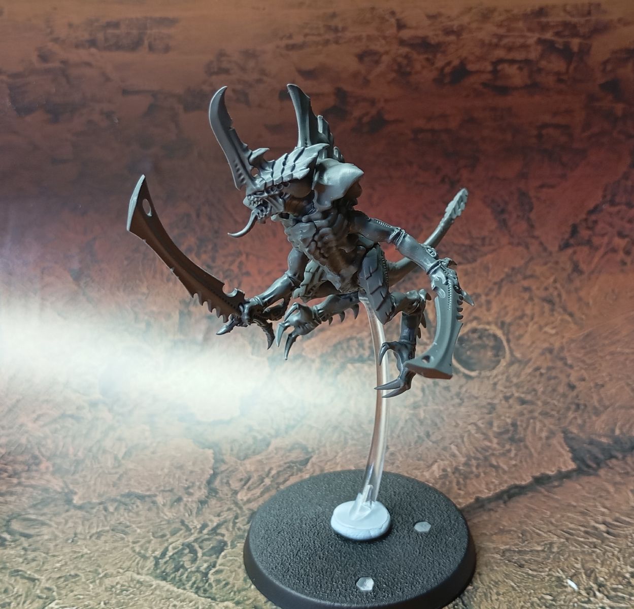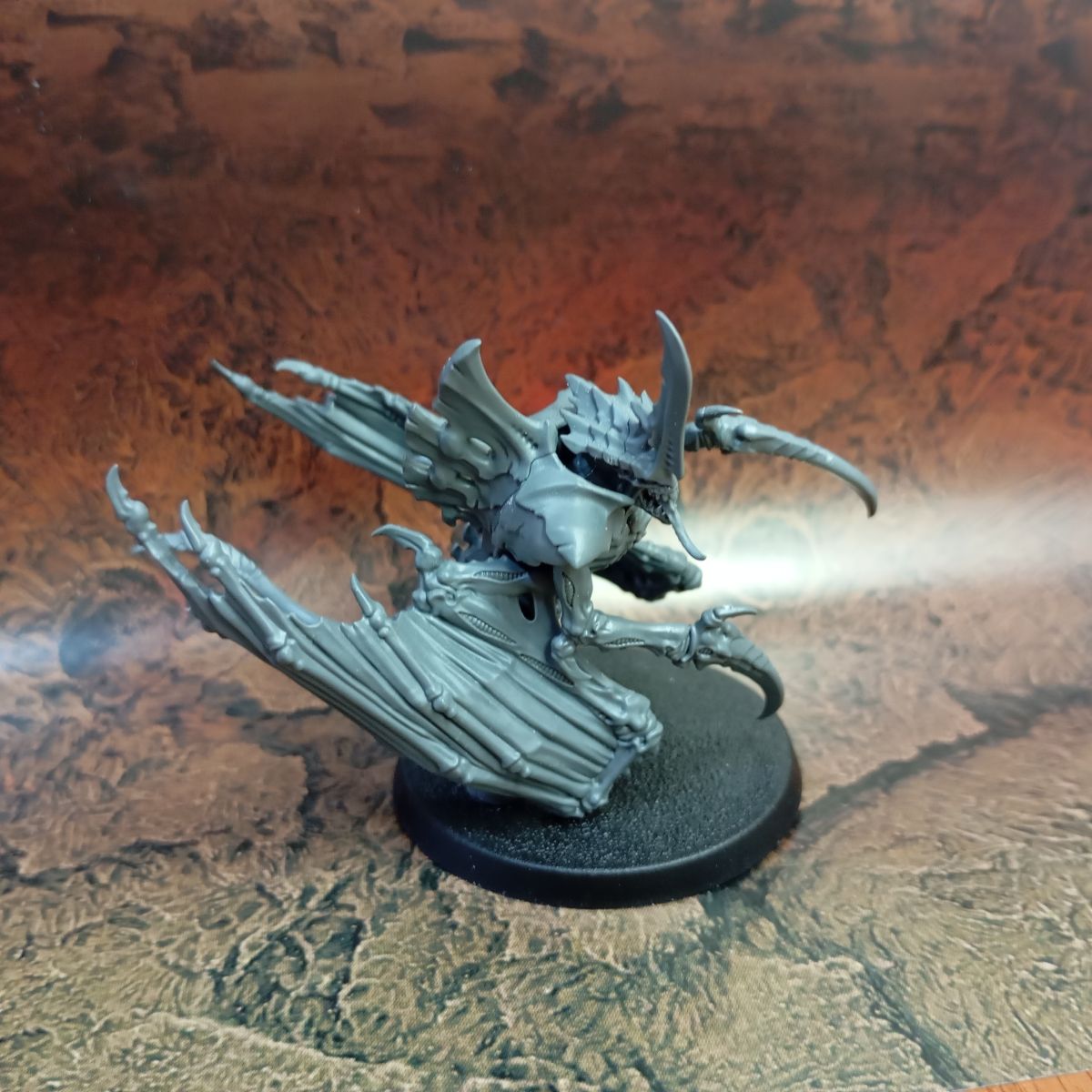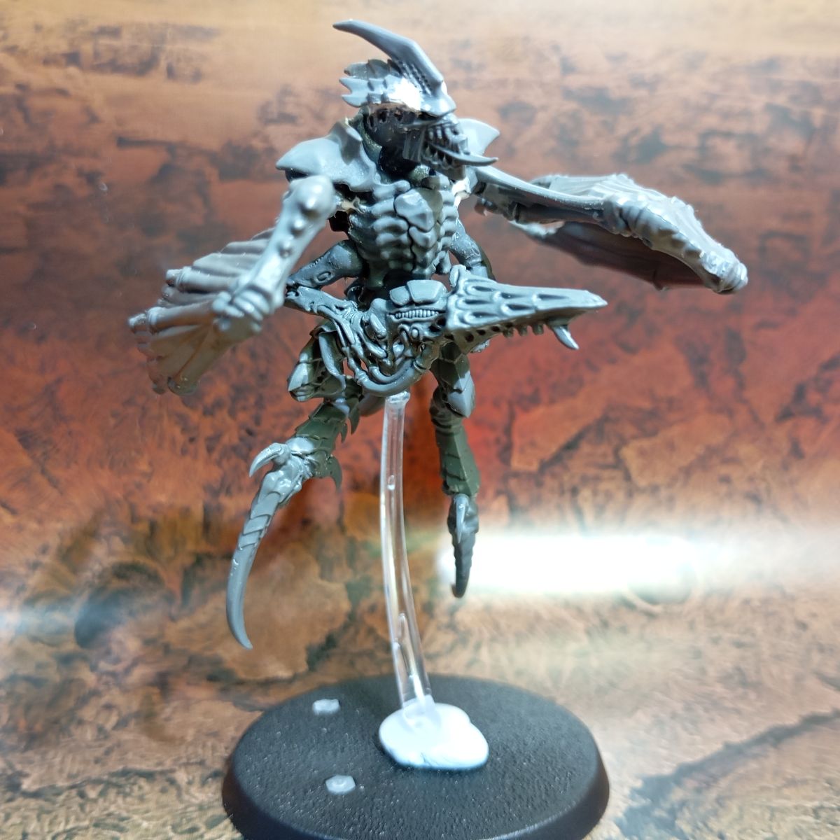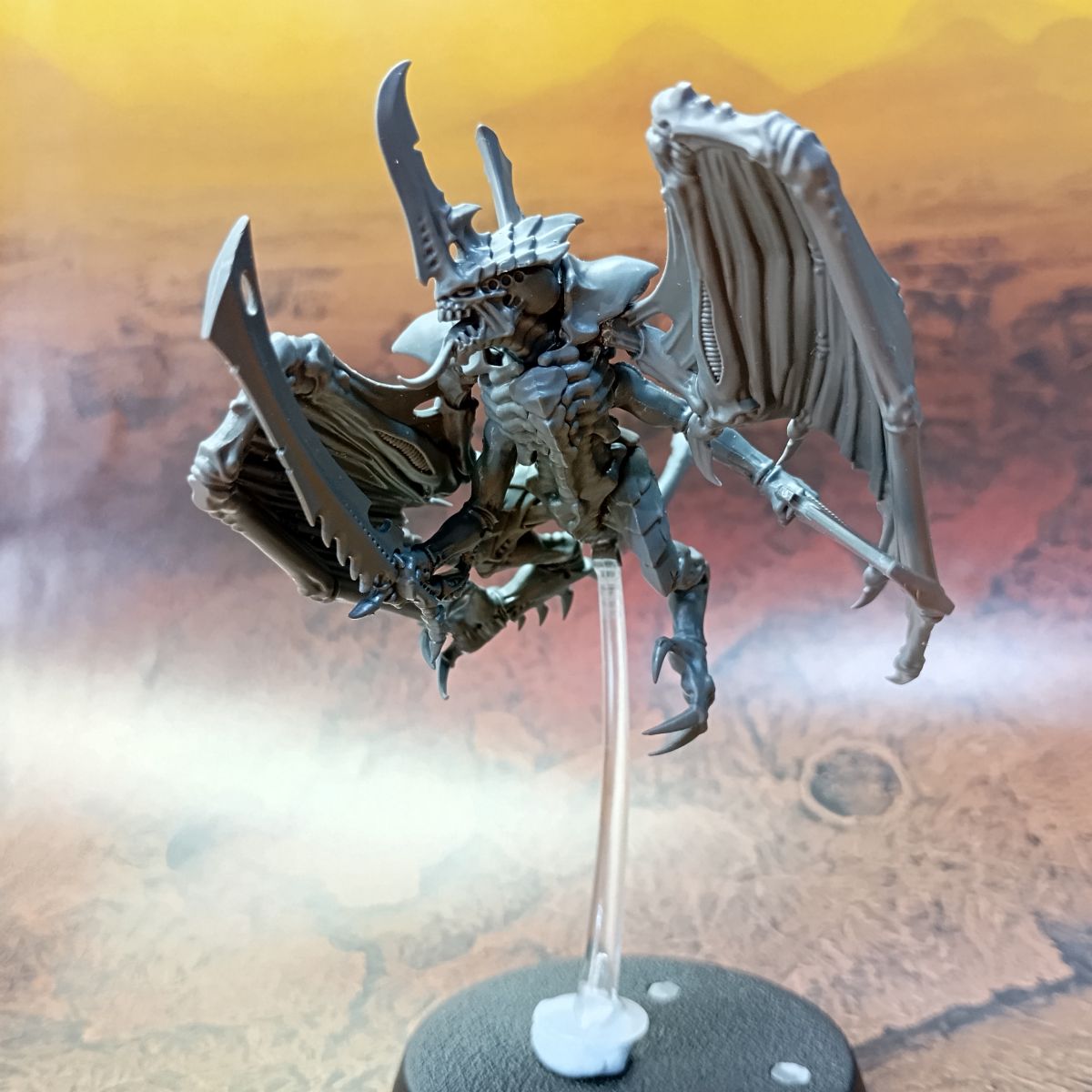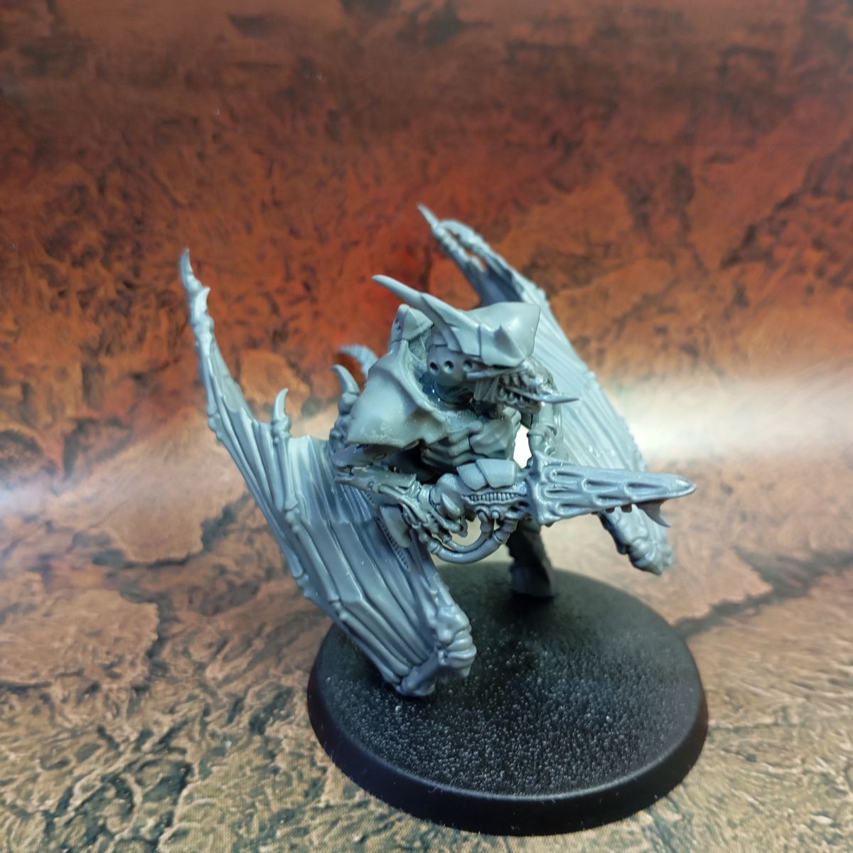 - Lo primero es tener claro qué tipo de tropa queremos hacer; en mi caso primero haré una conversión del Prime Alado en una peana voladora, con lo que voy a mantenerle las crestas dorsales y el montaje inicial es el mismo que la figura original, pero como quiero colocarla sobre una peana voladora, le hago una pequeña muesca en la base de la cola para añadirle una pieza de plástico circular dónde encajaré el mástil transparente.