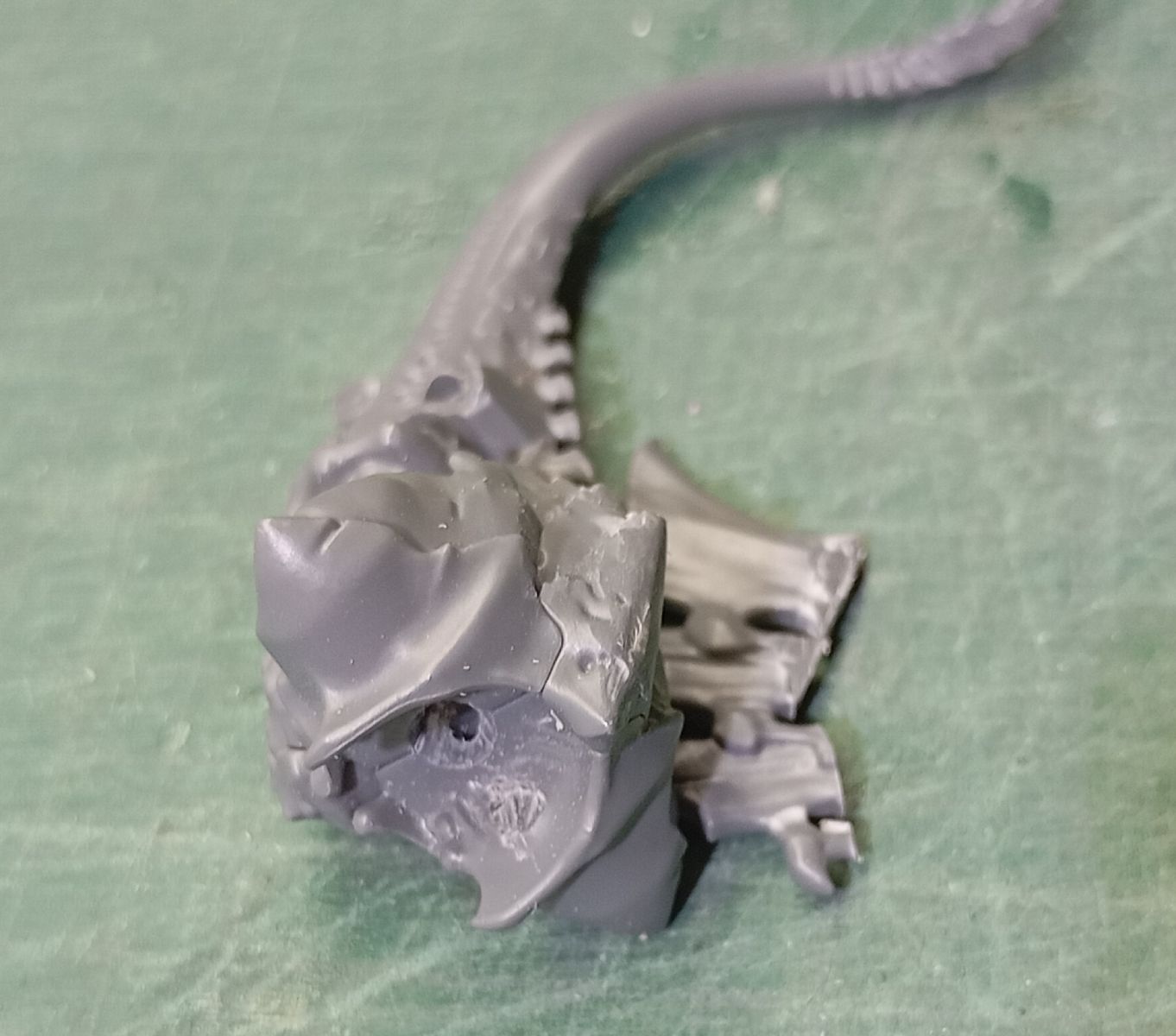 - Para los élitros seguiremos los mismos pasos anteriores, pero cortando y limando las crestas dorsales para dar el aspecto de guerreros tiránidos normales, y aprovechando las cabezas de gárgolas sobrantes de otra transformación para dejarlos como guerreros normales, así que hay que tapar el hueco donde se encaja la cabeza original y hacer un nuevo hueco en la base para poder encajar el cuello de la cabeza.