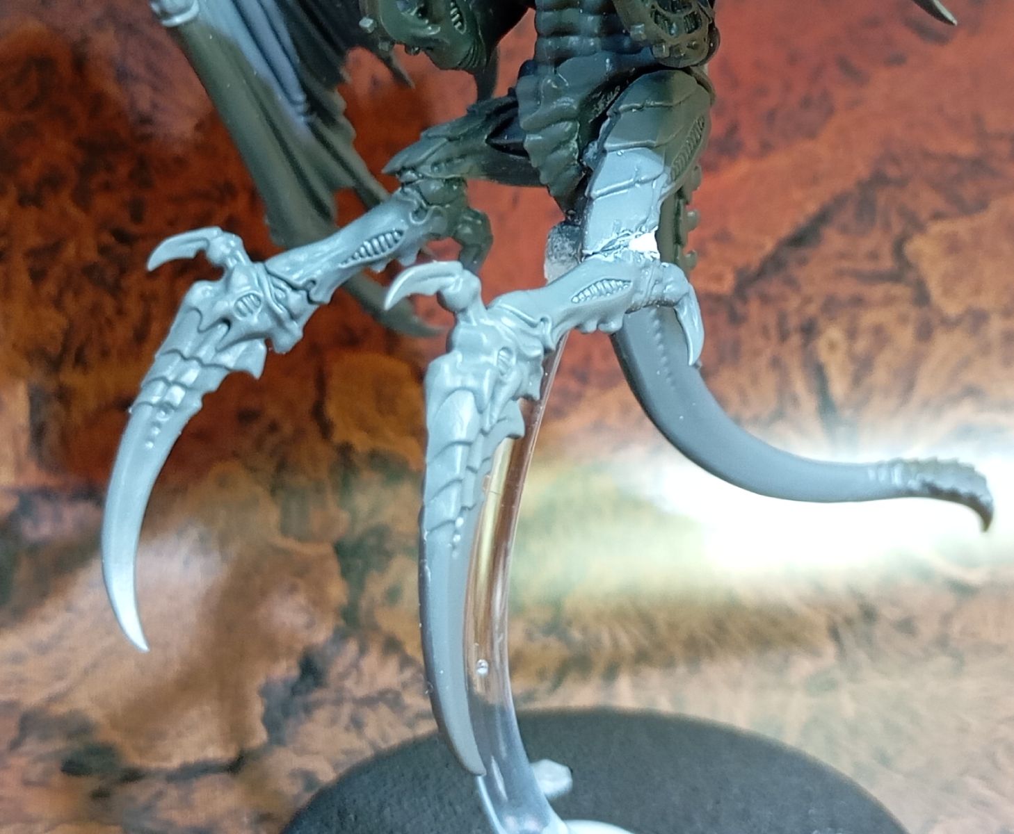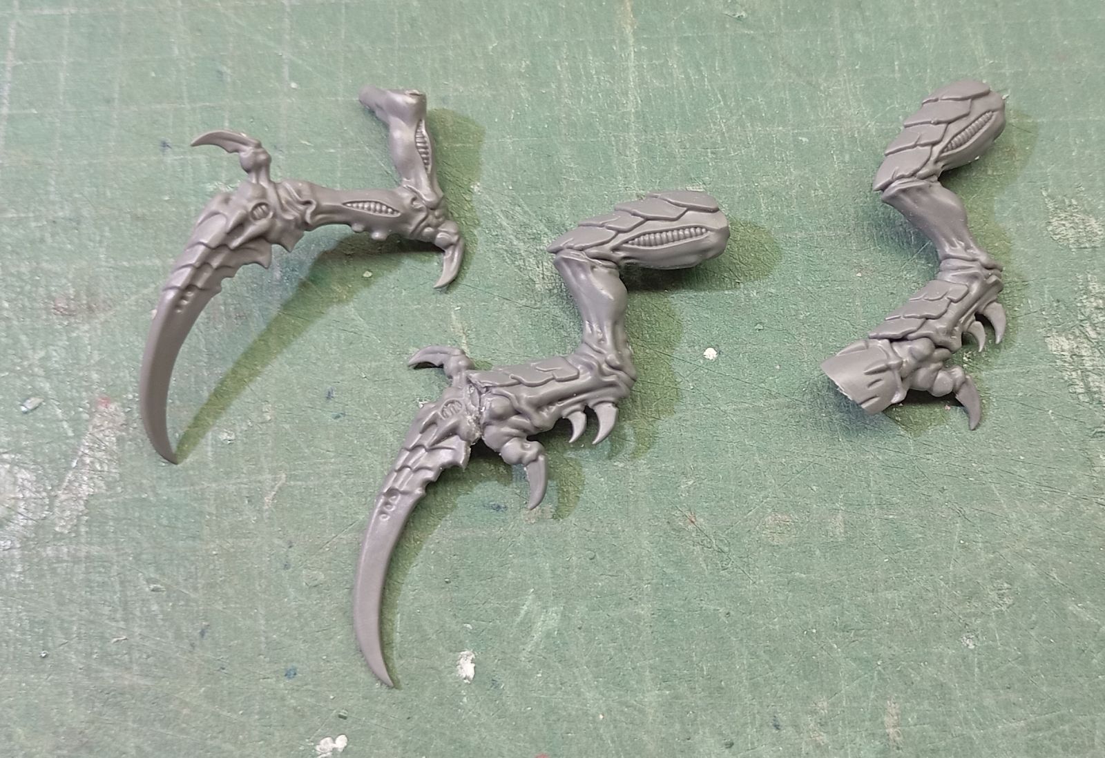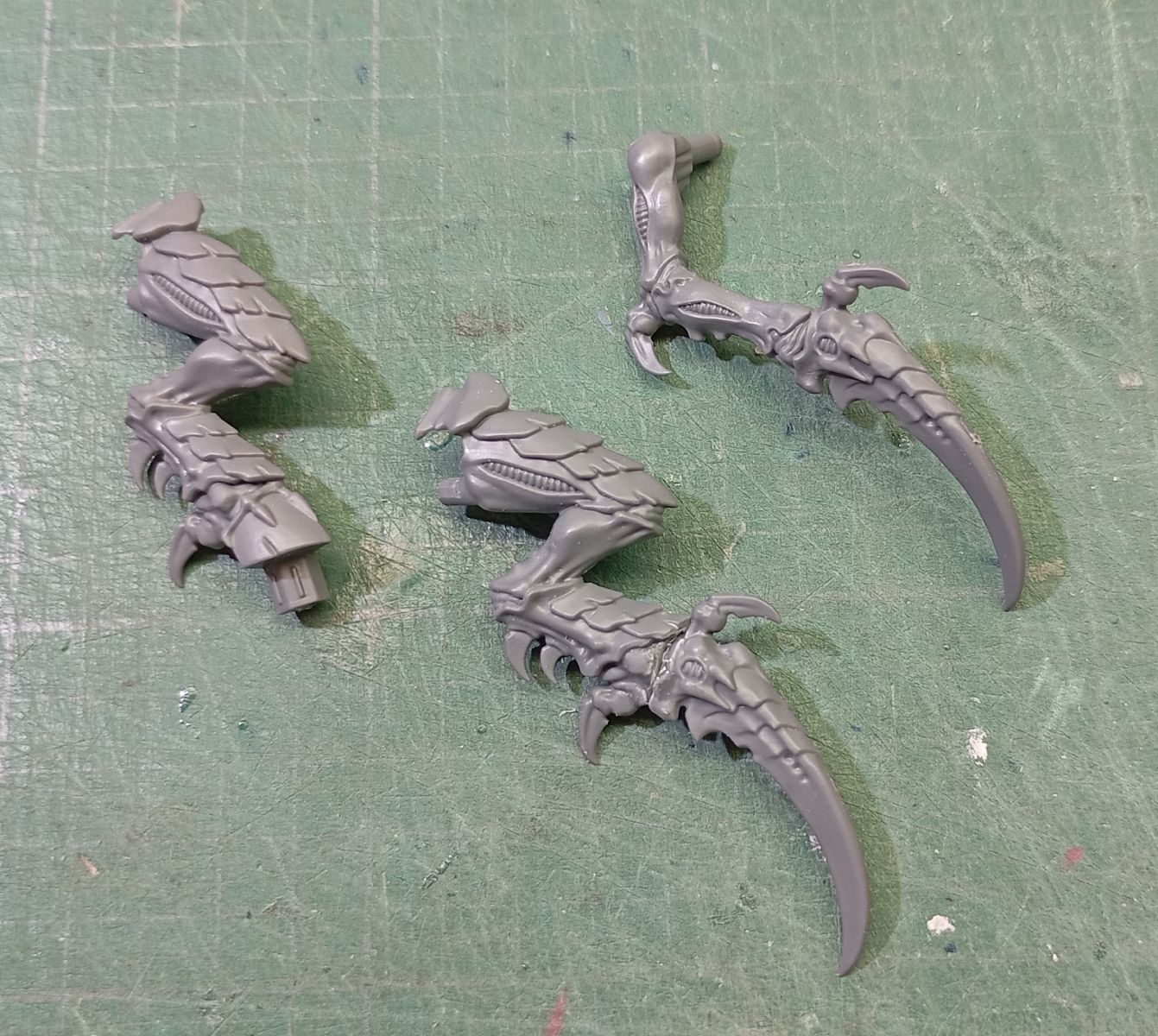- A continuación vienen las piernas: los élitros reemplazan un par de extremidades para las alas, pero siguen teniendo la misma capacidad ofensiva con dos pares de extremidades más para armas, así que vamos a reemplazar la mitad inferior de las piernas por unas garras acerantes sobrantes del cajón de restos; si habéis montado alguna unidad de Guerreros Tiránidos, seguro que os sobran armas.